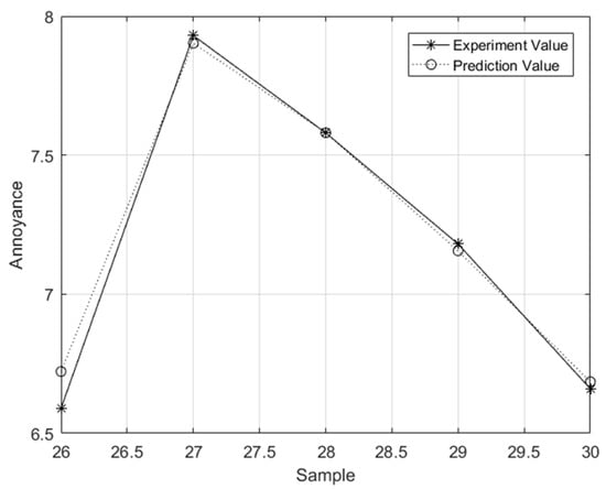 The weight matrix and the threshold matrix of the fuzzy adaptive PSO-ELM model of the sound quality prediction after training is shown in Table 5. The parameters were put into Formulas (6), (12) and (13). The subjective annoyance of sound quality could be obtained by calculating objective evaluation parameters and substituting them into the established mathematical model.