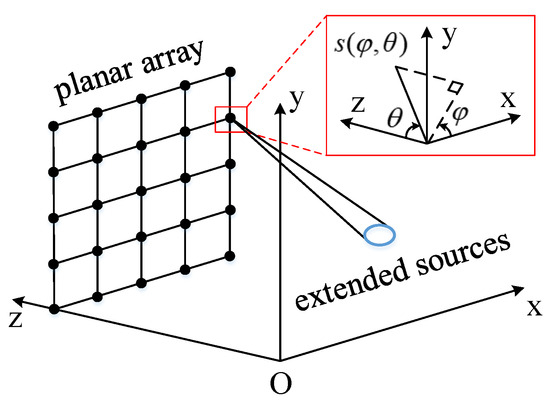 As the key parameter of Equation (1), the array manifold matrix A directly affects the accuracy of DOA estimation. Considering the spatial geometric relationship between the extended sources and the array shown in Figure 1, the time difference between the transmissions of the incident monopole source from the first sensor to sensor can be defined as