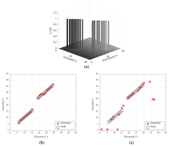 Figure 3b,c demonstrates the 2D-DOA maps of the method 2DTV-CES and LASSO, respectively. The results show that 2DTV-CES can estimate all focusing directions. Especially, there are 19 directions with zero deviation, and 2 directions have 1° deviation. Only 11 of 21 directions can be estimated by LASSO with more than 1° deviation. Both methods can estimate two peaks within the allowable ±2° deviation. Compared with the DOA’s estimation, the 2DTV-CES is better than LASSO, since 2DTV-CES introduces and utilizes TV-norm regularization on the basis of LASSO, which promotes piecewise constant and peak solutions.