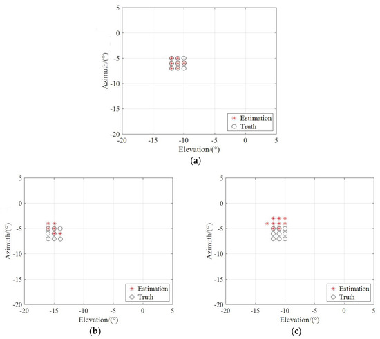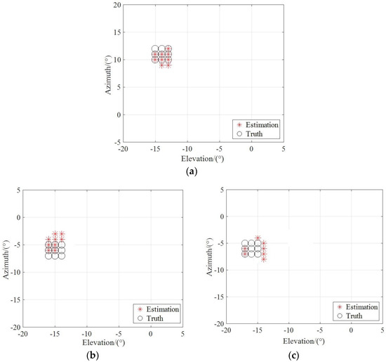 Figure 2b,c shows the 2D-DOA’s estimation maps of 2DTV-CES and LASSO respectively. It can be seen that the 2DTV-CES can accurately estimate all focusing directions with TV-norm regularization. There are 19 focusing directions of 21 directions that can be accurately distinguished, and only 2 focusing directions with 1° deviation. They are also within the allowable error range ±2°, and can be regarded as effective estimation. Moreover, the two groups of focusing direction can be effectively separated. Relatively speaking, the estimation accuracy of LASSO is poor. There are only 11 focusing directions out of 21 directions that can be identified and are unable to distinguish between different groups. This is because LASSO can only promote solution sparsity in the data domain but not in the gradient domain.