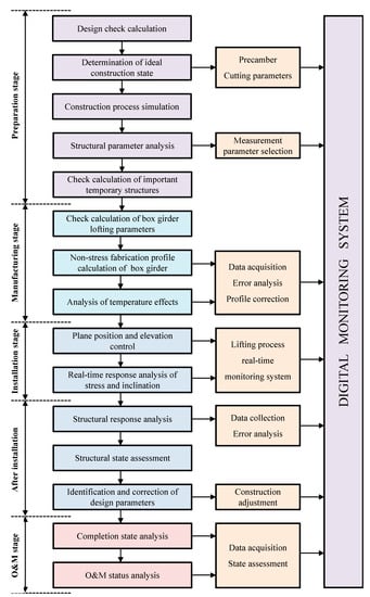 Based on different construction states, construction monitoring can be divided into the preparation stage, prefabrication stage, installation stage, post-installation, and bridge operation and maintenance stage, as shown in Figure 2. On this basis, a perfect monitoring system has been established, combined with digital technology.