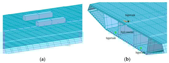 Figure 5a,b show the simulation of the temporary corbel connection and support of the bridge, respectively. The nodes, which were arranged at the support positions according to the design scheme, were rigidly connected to the corresponding nodes of the beam body using a rigid connection. Meanwhile, the corresponding translational displacement was restrained at the support. Based on the specialized construction and installation plan of the steel box girder, the temporary supports were arranged during the construction process and the time of the system conversion was determined. When the hoisting work of the steel box girder was done, the temporary corbel connection was set, connecting with the former girder.