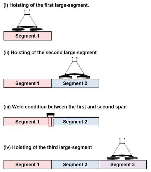 In recent years, the hoisting construction of a large-segment steel box girder which can install beams exceeding 100 m at a time has become highly popular in bridge engineering, particularly under challenging cross-sea or cross-river natural conditions and complex urban environmental conditions [5,6]. Typical cross-sea projects include Japan’s Tokyo Bay Cross-sea Bridge [7] and Denmark’s Great Belte Strait East Bridge Approach Bridge [8]. After these, Su-Tong Yangtze River Bridge [9], Chong’qi Bridge [10], and non-navigable span bridges in deep water area of Hong Kong-Zhuhai-Macao Bridge [11] came into being. Large-segment hoisting has many advantages, such as a short construction period, high construction safety, and strong adaptability to the environment. With this construction method, a large-segment steel box girder must go through many stages, such as factory manufacturing, field installation, and bridge connection. Therefore, the geometric state of the bridge will change greatly in each construction stage, resulting in multiple alignments that are difficult to control. In addition, it is difficult to adjust the alignment in the large-segment hoisting process through the cushion block or weld width, which can only be used in the small-segment hoisting process. With the continuous increase of modern bridge spans, the accuracy of large-segment steel beam manufacturing, the precision requirements of hoisting positioning, and the difficulty of alignment monitoring are all improved. From the perspective of beam manufacturing to hoisting positioning and even operation and maintenance in the future, the task of construction monitoring becomes particularly important [11,12,13,14,15,16,17]. However, the monitoring technology of large-segment construction is not mature enough. A standardized monitoring system has not been established, and the monitoring scope is not clear enough. Some construction monitoring methods are difficult to adapt to the complex and changeable construction environment, or can only monitor a part of the bridge, resulting in the absence of integral response collection [18]. A large number of monitoring data need to be analyzed and processed in order to find and solve problems in time. However, the lack of data processing and analysis ability of the monitoring system at present leads to the low utilization rate of monitoring data, a lag of information, and delays in decision-making. It is still a topic full of opportunities and challenges to identify how to better utilize digital technology, combine contemporary cybernetics with large-segment hoisting construction, encourage the renewal of monitoring instruments, speed up information transmission and processing [19], and improve the effectiveness and accuracy of monitoring systems.