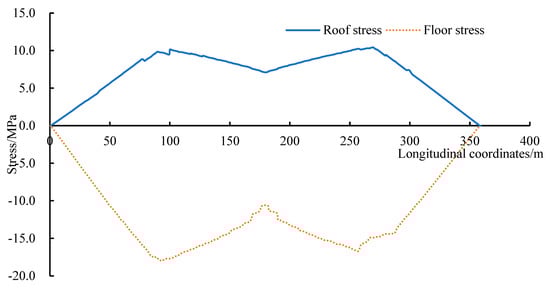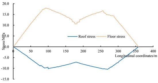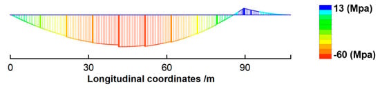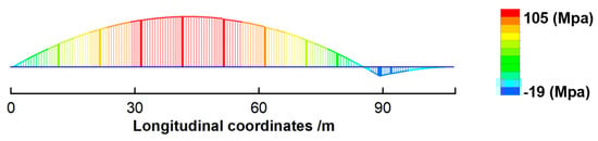 The temperature gradient is set in a consistent manner with deflection deformation to study the effect of local temperature on structural stress. Due to the fact that there are no additional constraints on the steel box girder as a statically indeterminate structure during the lifting condition of 1#, the temperature gradient does not have an impact on the corresponding stress under the lifting condition of 1#. Under the action of positive temperature difference in the bridge completion condition, the stress range of the top plate of the structure is −10.4~0 MPa, and the stress range of the bottom plate is 0~18 MPa. Under the action of negative temperature difference, the stress range of the top plate of the structure is 0~10.4 MPa, and the stress range of the bottom plate is −18~0 MPa. The results of stress calculation are shown in Figure 20 and Figure 21.