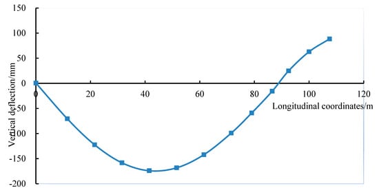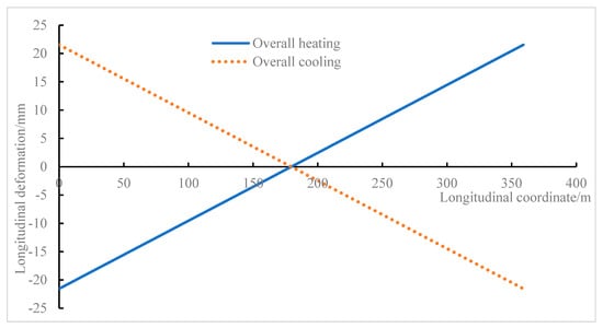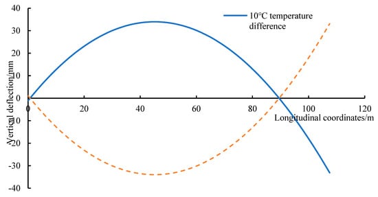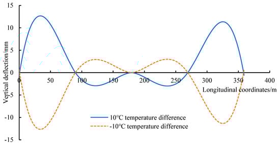 Taking an overall temperature rise of 10 °C and an overall temperature drop of −10 °C, the longitudinal deformation of the structure under the overall temperature difference is shown in Figure 17. The fixed support is located at 0 m, and the structural deflection remains virtually unchanged under the overall temperature difference.