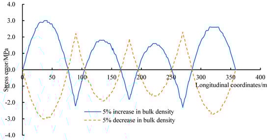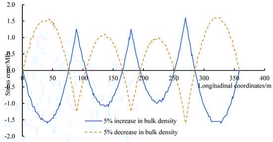 According to the calculation of a 5% error in bulk density, the variation of stress during the lifting condition of 1# and the completion condition of the bridge is calculated. A 5% error in bulk density results in a maximum error of ±1.6 MPa for the stress of top plate and an error of ±3.0 MPa for the bottom plate. The influence value of bulk density on the stress of the top and bottom plates of steel box beams is shown in Figure 13 and Figure 14.
