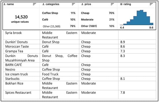 The dataset was collected from user reviews and ratings on the popular restaurant review social media platform, Foursquare.com. Web scraping is the process of automatically extracting data from websites using software tools called web scrapers [36]. This dataset includes various features such as restaurant names, ratings, tips, and locations for restaurants based in Riyadh city, totaling 14,520 unique values. The dataset is publicly available on Kaggle.com (www.kaggle.com/datasets/fahd09/riyadh-restaurants-20k), and Figure 2 provides a snapshot of the data.