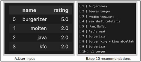 After creating the feature matrix, the user profile is multiplied with the feature matrix to obtain the weighted matrix. The weighted matrix represents the similarity between the user’s preferences and the features of each restaurant. The weighted matrix is then sorted in descending order based on the similarity values, and the top 10 recommendations are presented to the user. Figure 4 depicts an example of the user input and system recommendations.