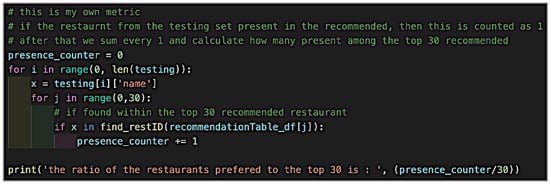As compared to other regression and classification algorithms, content-based methods do not have a direct method for evaluating the feasibility of recommendations using well-known metrics such as RMSE, MAE, Recall, and Precision. As a result, the evaluation of this model must be completed with the help of the user, which is not always reliable as it is based on personal preferences rather than objective facts. To evaluate the content-based recommender system, we created a custom metric to assess the recommendations’ quality. We have used the test set to evaluate the system. We hid 40% of the user’s data from the system to use them as testing data. Then, we derived the recommendations from the remaining 60% and selected the top 30 recommended restaurants. We then searched for the presence of the 40% of restaurants among the top 30 recommended restaurants and calculated the ratio of the present restaurants among the 30 recommended restaurants. This metric is shown in Figure 6.