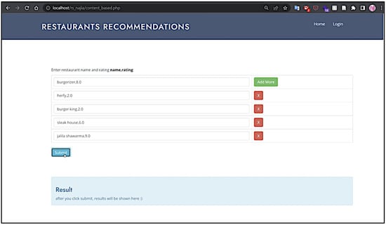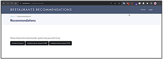 The content-based recommender system was developed using Python, with libraries Pandas, NumPy, and RegEx utilized for data cleaning and manipulation. The system uses weighted matrices to generate a list of similar restaurants based on the user’s profile features. For the user interface, PHP was used to create a home screen that directs the user to the desired recommender system, as shown in Figure 7.