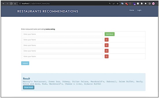 After submitting the entries, the user can view the results by clicking on the “show results” button, as shown in Figure 9. The web page displays the recommended restaurants based on the user’s input and provides information such as the restaurant’s name and address.