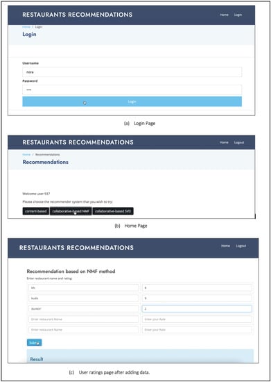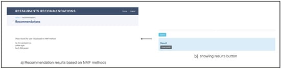 For the collaborative-based recommender system, we employed only two matrix factorization algorithms, namely NMF and SVD. Figure 10a,b display the user interface for the collaborative-based filtering system, which includes a login page and home page with three buttons: content-based, collaborative-based NMF, and collaborative-based SVD.