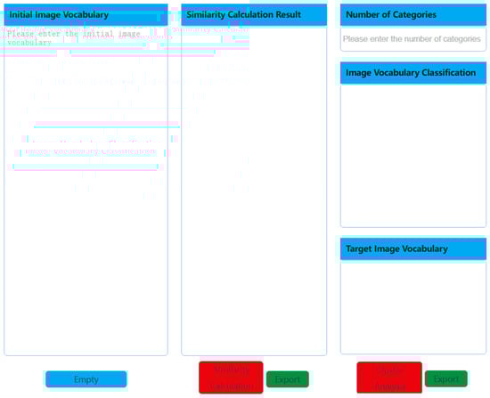 The parameters Q(r) and α in the image vocabulary similarity calculation model are determined based on people’s cognition of the product styling. Therefore, the image vocabulary similarity calculation model is consistent with people’s cognition of product styling and has improved applicability. This study utilized the image vocabulary similarity calculation model to determine the similarity values. Figure 1 illustrates the developed image lexical similarity calculation platform []. This platform includes two functional modules: image vocabulary similarity calculation and cluster analysis.