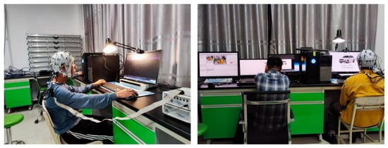 The electroencephalogram is a reflection of the electrophysiological activity generated from postsynaptic potentials between brain cells, which can be observed on the surface of the cerebral cortex or scalp. EEG offers a noninvasive approach to capture and assess the brain’s electrical activity []. Presently, the EEG technique is the predominant method employed to measure brain waves due to its exceptional temporal resolution []. EEG activity in the cerebral cortex can be classified into evoked and spontaneous signals. Evoked EEG signals, also known as event-related potentials, stem from the higher-level functional activities of the brain [,]. In contrast, spontaneous EEG signals are recorded when the cerebral cortex is not under significant stimulation. The sensitivity of EEG signals to neural activity alterations enables the real-time observation of individual perceptual cognitive processes that cannot be discerned through explicit user measurements. Compared to traditional Kansei engineering methodologies, EEG can provide insight into users’ perceptual image cognitive processes on a millisecond scale. Emotions that elude measurement via traditional techniques, such as semantic differential questionnaires and self-reports, can be precisely captured using EEG. This enables an in-depth examination of users’ image cognition processes.