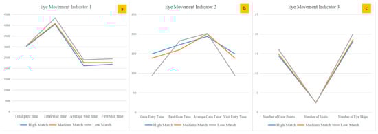 Figure 9b reveals a descending pattern in the gaze and visit entry times of the study samples across the “high match”, “medium match”, and “low match” categories. Among study samples with identical target image matchings, the average gaze time was large for gaze entry, first gaze, and visit entry times. The data of different eye-tracking indexes indicate a consistent pattern for gaze and visit entry times, and the “low match” category has the shortest gaze and visit entry times compared to other match categories.