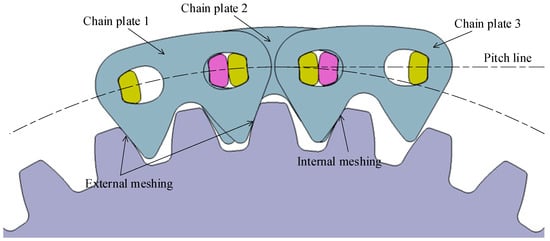 The ideal state of the internal–external composite meshing between chain plate and sprocket.