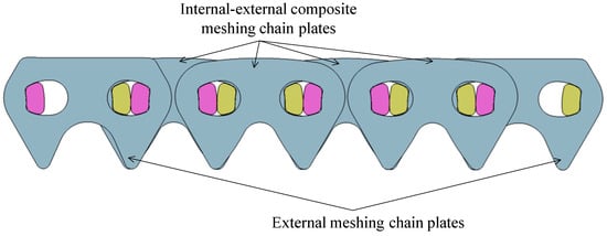A Hy-Vo chain is a type of silent chain with rocker pin joints. Benefiting from the construction of the rocker pin joint, the Hy-Vo chain can not only carry a higher torque, but also has a lower system polygon action [1,2]. Therefore, the Hy-Vo chain is extensively applied to areas of heavy loads and high speeds, such as the transfer case in hybrid vehicles. The previous studies have already proved that the internal–external composite meshing mechanism is the best way to improve the transmission performance of a round pin jointed silent chain system [3]. When an external meshing Hy-Vo chain meshes with a sprocket with the involute profile, because the essence of the external meshing is a kind of positioning, the meshing impact between the chain plate external profiles and the sprocket involute profiles is not avoidable [4]. Supposing that the internal–external composite meshing mechanism exists in the Hy-Vo chain system, as Figure 1 shows, the left internal profile of chain plate 3 will first mesh with the sprocket before the external profiles of chain plate 2 come into contact with the sprocket; thus, the meshing impact can be mitigated. Moreover, the classical meshing theory also holds that the internal meshing profile for the internal–external composite meshing Hy-Vo chain should be a kind of arc with a certain convexity [5]. However, the above analysis is only a kind of hypothesis, and it is just suitable for the round pin jointed silent chain system. Furthermore, whether in engineering or in a laboratory, there is no feasible internal–external composite meshing Hy-Vo chain system [6]. Although an internal–external composite meshing Hy-Vo chain does not exist, as Figure 2 displays, some researchers have found that the transmission performance of the Hy-Vo chain system can be improved if the internal–external composite meshing chain plates can be added to the external meshing Hy-Vo chain, and they named the mixed assembly silent chain as a new type Hy-Vo chain [7]. However, the mixed assembly Hy-Vo chain is not applied on a large scale because of its unstable performance. As a result, studying and analyzing the internal meshing profile and internal–external composite meshing mechanism of the Hy-Vo chain are necessary to perfect the meshing theory of the silent chain.