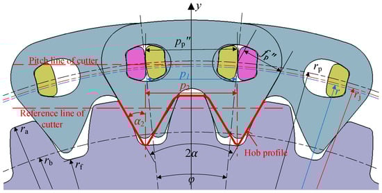 In the silent chain meshing research area, the chain–sprocket–hob meshing system is always used to analyze the external meshing relations between the chain and the sprocket, as Figure 5 shows. The solid red line denotes the profile of the hob; the hob pitch is p2, and the hob half-tooth angle is α2. The meshing parameters of the Hy-Vo chain and sprocket are listed in Table 2 [22].