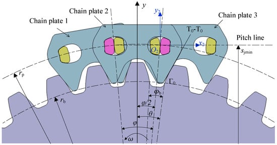 When there is only an external meshing mechanism for the Hy-Vo chain, the meshing between the chain and the sprocket is instantaneous. In Figure 6, the origin of the absolute coordinate system S(xOy) coincides with the rotation center of the sprocket. S2(x2O2y2) is the reference coordinate system to design the internal meshing profile of the internal–external composite meshing Hy-Vo chain plate. The sprocket rotates anticlockwise at velocity ω, and the sprocket is symmetrical along the y-axis. In this case, chain plate 1 is positioned on the sprocket, chain plate 3 is straightened horizontally, and chain plate 2 meshes with the sprocket while it is also horizontally straightened. Supposing that the right-side external meshing profile of chain plate 2 is T0-T0, the relative sprocket tooth involute profile is Γ0, the relative rotation angle of involute Γ0 on the base circle of the sprocket from the y-axis to its practical position is θ, the corresponding angle of the space width of the sprocket on the base circle is φb. For the above parameters, the following is posed: