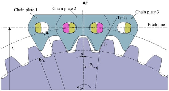 If we rigidify the external meshing Hy-Vo chain into a rigid body, the chain can be regarded as a rack, and the sprocket can be regarded as a short addendum gear. At this time, the meshing of the rigid Hy-Vo chain and the involute sprocket will be the same as the gear meshing, and the meshing is continuous, as Figure 7 shows. The distance between the pitch line of the rigid Hy-Vo chain and the rotation center of the sprocket is sj. According to the gear meshing theory, if the sprocket rotates angle β anticlockwise from its initial position, the rigid Hy-Vo chain will horizontally move βrj to the left. It should be noted that rj is the radius of the sprocket pitch circle when the Hy-Vo chain can be regarded as a rack. In this case, based on Equation (3), the value of rj is as follows: