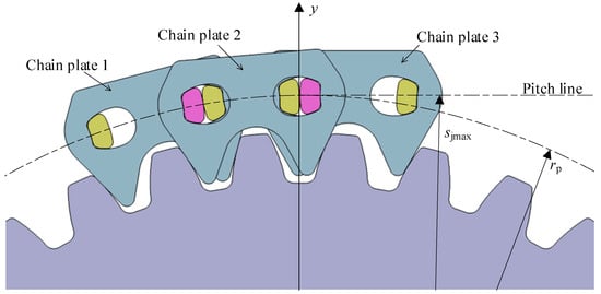 In actuality, the Hy-Vo chain cannot be a rigid body as a rack, and the distance between the chain pitch line and the sprocket rotation center sj will change with the change in the sprocket rotation angle if the sprocket rotates from its initial position. As Figure 8 demonstrates, when the pitch of chain plate 2 is fully within the sprocket positioning circle, sj will be at its maximum: