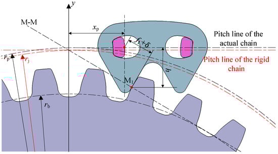 Based on the periodic motion characteristics of the chain, when xp = 0, the meshing between the internal meshing profile and the involute tooth profile must be finished. At this time, the distance between point M1 and the actual chain pitch line is at a minimum, which is