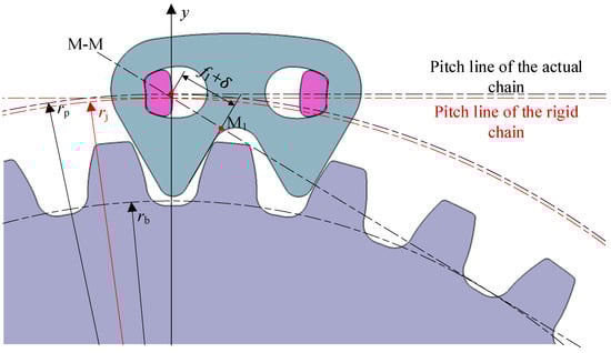 Figure 10 shows the ideal state of the internal–external composite meshing between the chain plate and the sprocket. In this case, the distance between the left pitch point of the chain plate and the y-axis is supposed to be xp, and the distance between the pitch line of the actual chain and the sprocket rotation center should satisfy sjmax = rp. Under the influence of the convexity of the internal meshing profile, the distance between the left pitch point and the left internal meshing profile is f1 + δ. Supposing that the meshing line of the chain and sprocket is M-M, according to the meshing theory, line M-M tangents to the base circle of the sprocket and passes through the intersection point between the y-axis and the pitch circle of the sprocket. If the internal meshing point between the chain plate and the sprocket is M1, point M1 must be on meshing line M-M.