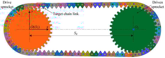 In this paper, we use the CAE software RecurDyn V9R3 to simulate these three groups; the multi-body dynamics model is shown in Figure 12. In this model, the origin O of the absolute coordinate system S(xOy) is fixed on the drive sprocket rotation center O1. The driven sprocket rotation center O2 is on the x-axis, and the initial system center distance is Sd. When the system is running, under the action of preload F = 800 N, the driven sprocket rotation center O2 will fluctuate horizontally. The simulation time is 0.8 s, and the simulation step is 200. The range of the drive sprocket speed is [1000 rpm, 6500 rpm], and the interval is 500 rpm.