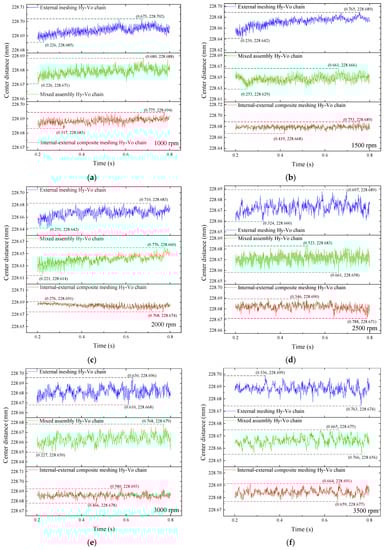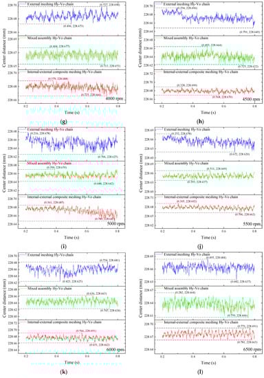 Figure 13a–l display the simulation results about the system center distance fluctuations of the three groups. We take the calculation process of the maximum fluctuation difference of system center distance when the speed of the drive sprocket is at 1000 rpm as an example. In Figure 13a, as for the external meshing Hy-Vo chain system, when time is equal to 0.673 s, the value of Sdmax is 228.702 mm. When time is equal to 0.226 s, the value of Sdmin is 228.685 mm. Based on Equation (23), we can yield the value of the maximum fluctuation difference of 228.702 − 228.685 = 0.017 mm. As for the mixed assembly Hy-Vo chain system, the maximum value of Sd is reached at 228.688 mm when the time is 0.680 s, and its minimum value is reached at 228.671 mm when the time is 0.226 s. Therefore, the value of Δf is 228.688 − 228.671 = 0.017 mm. As for the internal–external composite meshing Hy-Vo chain system, the value of Sdmax is 228.694 mm when the time is 0.775 s, and the value of Sdmin is 228.683 mm when the time is 0.317 s, so Δf should be 228.694 − 228.683 = 0.011 mm.