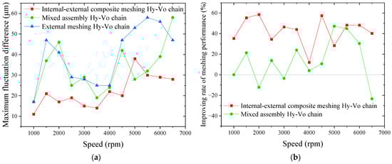 Moreover, the results also show that the polygon action of the Hy-Vo chain system is not always consistent with its meshing performance. For example, when the speed is at 2000 rpm, the polygon action of the mixed assembly Hy-Vo chain system is improved by 30.92%; based on the classical theory, the meshing performance and the transmission stability should also be improved to nearly the same level. However, based on Figure 14b and Figure 15b, the meshing performance of the mixed assembly Hy-Vo chain system is worsened by 12.20% instead, and the transmission stability of that is worsened by 2.37% instead. As a result, the system polygon action is not always consistent with its meshing performance, and the system polygon action cannot be evaluated by testing the maximum fluctuation difference of system center distances.