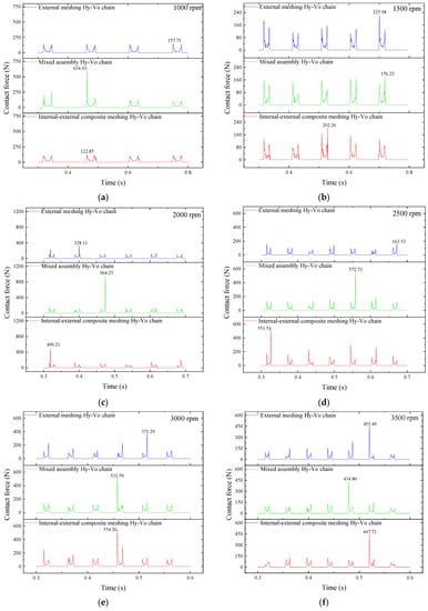 In this paper, we use the contact force between the target chain link and the drive sprocket to roughly represent the meshing force between the Hy-Vo chain and the sprockets. As Figure 16 demonstrates, the contact forces appear periodically with the simulation time, and the meshing impacts occur during a period of time at the beginning and end of meshing. This coincides with the time of the contact and separation between the chain link and the sprocket tooth. To analyze the effects of the meshing mechanisms on the meshing impacts under different speeds, we extract the values of the maximum meshing impacts and the values of the average meshing impacts of the three groups at different speeds from Figure 16, as Figure 17 displays.