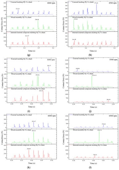 Meshing force between the target chain link and the drive sprocket: (a) 1000 rpm; (b) 1500 rpm; (c) 2000 rpm; (d) 2500 rpm; (e) 3000 rpm; (f) 3500 rpm; (g) 4000 rpm; (h) 4500 rpm; (i) 5000 rpm; (j) 5500 rpm; (k) 6000 rpm; and (l) 6500 rpm.