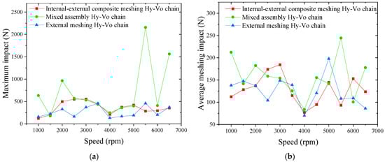 We know from Figure 17a that the maximum meshing impact of the external meshing Hy-Vo chain system at most speeds is the smallest, and that of the mixed assembly Hy-Vo chain system at most speeds is the greatest. From Figure 17b, we can know that, at the speeds of 1000 rpm, 1500 rpm, 3500 rpm, 4500 rpm, and 5500 rpm, the average meshing impact of the internal–external composite meshing Hy-Vo chain system is the smallest. At the speeds of 2500 rpm, 3000 rpm, 4000 rpm, 6000 rpm, and 6500 rpm, the average meshing impact of the external meshing Hy-Vo chain system is the smallest. When the speed is equal to 6000 rpm, the average meshing impact of the mixed assembly is the smallest. As a result, there are no sufficient data to support that the internal–external composite meshing mechanism can effectively mitigate the meshing impact between the Hy-Vo chain and the sprockets.