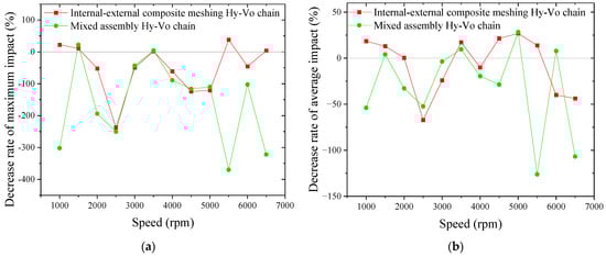 To further obtain the effect degree of the internal–external composite meshing mechanism on the reduction in the meshing impact, we take the meshing impact of the external meshing Hy-Vo chain system as the benchmark and calculate the decrease rates of the other two chain systems at all speeds, as Figure 18 demonstrates.