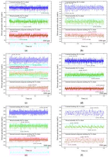 Taking the calculation of the fluctuation extent of the driven sprocket velocity at 1000 rpm as an example, based on Figure 19a, the maximum value of the driven sprocket velocity of the external meshing Hy-Vo chain system is 100.004 rad/s, and the minimum value of that is 98.090 rad/s; thus, the velocity fluctuation extent is 100.004 − 98.090 = 1.914 rad/s. The maximum value of the driven sprocket velocity of the mixed assembly Hy-Vo chain system is 99.854 rad/s, and the minimum value is 97.997 rad/s; thus, the velocity fluctuation extent is 99.854 − 97.997 = 1.857 rad/s. The upper limit of the driven sprocket of the internal–external composite meshing Hy-Vo chain is 99.840 rad/s, and the lower limit is 98.194 rad/s, so the velocity fluctuation extent is 99.840 − 98.194 = 1.646 rad/s.