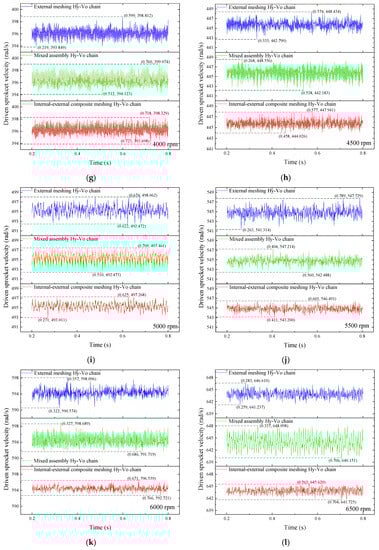 Rotation velocity fluctuation curves of driven sprocket: (a) 1000 rpm; (b) 1500 rpm; (c) 2000 rpm; (d) 2500 rpm; (e) 3000 rpm; (f) 3500 rpm; (g) 4000 rpm; (h) 4500 rpm; (i) 5000 rpm; (j) 5500 rpm; (k) 6000 rpm; and (l) 6500 rpm.