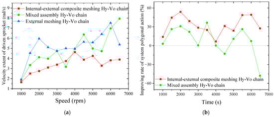 Compared with the external meshing Hy-Vo chain system, the velocity fluctuation extent of the mixed assembly Hy-Vo chain system is reduced by (1.914 − 1.857)/1.914 = 2.97%, and that of the internal–external composite meshing Hy-Vo chain system is reduced by (1.914 − 1.646)/1.914 = 14.00%. It means that the polygon action in the internal–external composite meshing Hy-Vo chain system is the smallest when the speed is at 1000 rpm. By using the same method, we can obtain the velocity fluctuation extents of the driven sprocket at all speeds, and we can obtain the improving rates of polygon action for the internal–external composite meshing Hy-Vo chain system and mixed assembly Hy-Vo chain system relative to the external meshing Hy-Vo chain system at all speeds, as Figure 20 demonstrates.