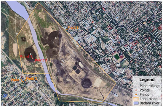 The factory was founded in the 1940s and was originally located outside the city boundaries; however, because of the high rate of urbanization, a new district of the city was formed in 2022, and new residential buildings were constructed in the mine tailings area. Over 2 million tons of waste were generated in the form of mine tailings over the lifetime of the factory [1] (Figure 1). The factory produced mainly metallic zinc and lead.