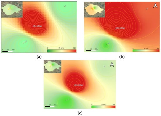 Spatial distribution map of heavy metals: (a) Pb, (b) Zn, and (c) Cd.