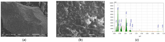 SEM produced two-dimensional data, which allowed visual identification of metal slag particle surfaces without sputter coating. According to the results of SEM-EDS analysis, the slag from mine tailings mainly contained SiO2 (22.2%), oxides (46%), and carbon (17.8%), in addition to Zn (9.08%) and Pb (4.22%), as shown in Figure 4c. Figure 4a,b show SEM images at 400× and 3000× magnification, respectively.