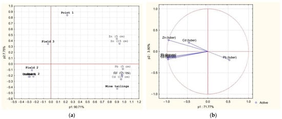 Principal component analysis for HM concentrations: (a) PCA loading plot of HM biplot; (b) loading plot of HM in sweet potatoes.