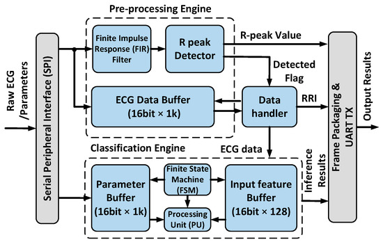 where SR is the sampling rate of ECG, generally not exceeding 1 kHz. The classification engine performs an inference of the input feature data, and a parameter buffer is included to store bias values and weights. The inference computation is completed by the PU under the control of a finite state machine (FSM). At the end of the classification, the RRI value and inference result are packaged into a frame and sent out by a Universal Asynchronous Receiver/Transmitter (UART).