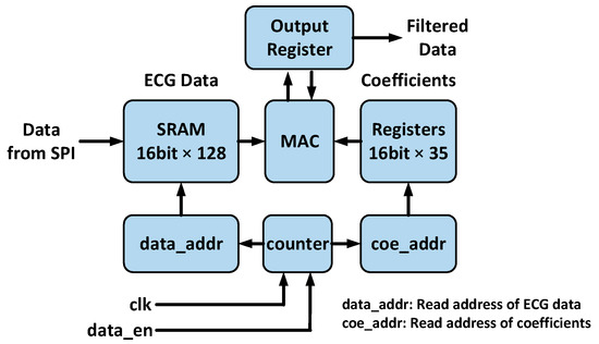 The application scenario of this design is that the ECG is collected using single lead ECG sensors (Xunda Radio Equipment, Hangzhou, Zhejiang, China) at a sampling frequency of 360 Hz and quantified as signed values with a bit-width of 16. The raw digitized ECG signals are first filtered using a 69-tap Finite Impulse Response (FIR) filter in the pre-processing engine to remove noise, such as power-line interference, baseline drift, electromyographic (EMG) noise, and motion artifacts [13]. Considering the frequency range of the QRS complex, the bandwidth is set to 2–28 Hz. The schematic of the FIR filter is shown in Figure 2. A 16-bit × 128 SRAM (Static Random-Access Memory) (UMC, Hsinchu, Taiwan, China) is used to cache the ECG data within a filtering convolution window. When new data arrive, the earliest data within the window are discarded to accommodate the latest data. The symmetry of the FIR coefficients is utilized here, and only half of the coefficients need to be stored. A counter is used to generate read addresses for SRAM and registers to obtain data. Due to the low sampling frequency, only a few hundred filtering operations are required per second. Thus, the time division multiplexing strategy is adopted, using only one multiplier accumulator (MAC) unit to complete all multiplication and addition operations, which greatly reduces the hardware overhead compared to filter structures based on a delay chain. The entire convolutional filtering operation takes N clock cycles (N is the number of taps).