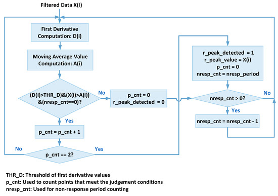 If D(i) > THR_D and X(i) > A(i), then p_cnt is increased by 1. THR_D represents the threshold of the first derivative values, which is set to five in this paper. When the above judgment conditions are met twice, the current data point X(i) is considered as an R-peak point, the R-peak detection flag is set to high, and the R-peak value is equal to X(i). In order to eliminate the interference of false peaks near the R-peaks, a non-response period (nresp_period) of 0.2 s is applied here, which is equal to the time of 60 sampling points. The nresp_cnt signal is used for counting the non-response time. When it is equal to 0, it indicates the end of the non-response period, and then the next R-peak will continue to be detected. The performance of the proposed R-peak detection method is evaluated using all 48 records in the MIT-BIH arrhythmia database [14], the true positives (TP), false positives (FP), and false negatives (FN) of each record are obtained, and the sensitivity (Sen) and positive precision rate (P+) are calculated as follows: