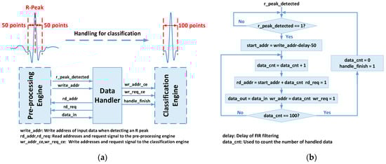 The data handler is used to transfer the data of segmented heart beats from the pre-processing engine to the classification engine, as shown in Figure 5a. The 50 data points before and after the R-peak are transmitted to the input feature buffer of the classification engine for a subsequent inference. Figure 5b illustrates the workflow of the data handler. The starting address (start_addr) for data handling is located 50 data points before the R-peak position. Once an R-peak is detected, the start_addr is calculated according to the index of the current input data, i.e., its corresponding write address (write_addr). Due to the delay caused by FIR filtering in the R-peak detection process, this delay needs to be subtracted in the calculation. After the starting address is determined, the data handling begins. The data_cnt signal is used to count the number of transmitted data points, which is also used as an offset to add to the starting address for generating read addresses (rd_addr); the addresses are input into the ECG Data Buffer along with the read request signal (rd_req). On the other hand, the data_cnt signal can be regarded as the write addresses, which are fed to the classification engine with the write request signal (wr_req). After the data_cnt reaches 100, the handle_finish signal is set to 1 to indicate the end of handling.