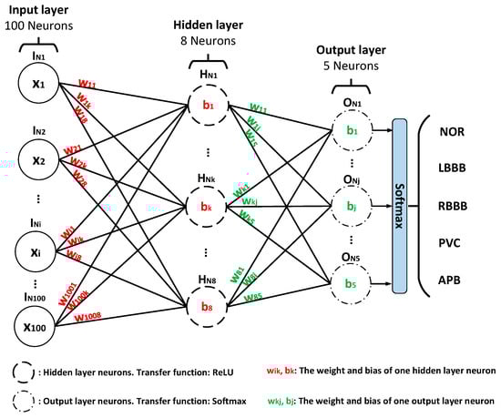 where is the size of the input layer, and , , and are the input, weight, and bias of one neuron, respectively. The results are activated by the rectified linear unit (ReLU) function, which is defined by (7). The output layer contains five neurons, representing a normal beat (NOR), left bundle branch block beat (LBBB), right bundle branch block beat (RBBB), premature ventricular contraction beat (PVC), and atrial premature beat (APB). The calculation of each neuron is the same as (6). To obtain the probability of each type, Softmax is used as the transfer function, which is defined as: