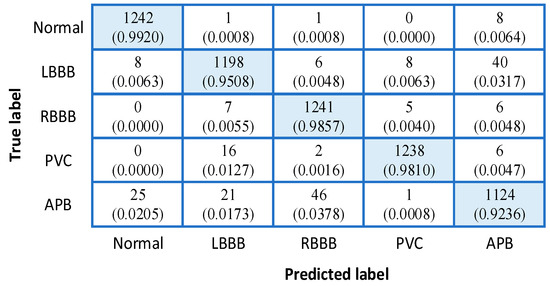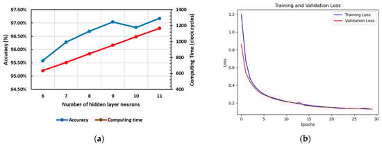 In addition to the already determined input and output layers, the construction of an ANN model is based on considerations of classification accuracy and energy efficiency. On one hand, the size of the hidden layer is an important parameter of ANN, which has a critical impact on the classification accuracy. On the other hand, by reducing hidden layer neurons while ensuring acceptable accuracy, the computation complexity and memory overhead can be reduced, resulting in less computing time and low energy consumption. We used grid search to try different hidden layers; as shown in Figure 7a, the computing time is estimated by the number of processing clock cycles required by PU. A hidden layer with eight neurons is selected because the model achieves a good trade-off, with R2 scores of 0.935 for training and 0.932 for testing. The loss curve for the proposed NN is shown in Figure 7b. The confusion matrix containing the prediction results is shown in Figure 8, and the overall classification accuracy is 96.69%. The sensitivity and positive predictive value (PPV) of each type are summarized, as shown in Table 2.