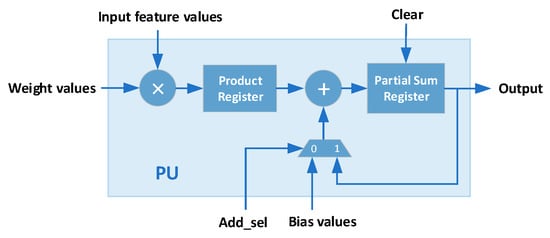 Due to the fact that the storage and computation of fixed-point values require fewer hardware resources compared to floating-point values, the weights and biases obtained from training are converted into a 16-bit fixed-point format with a 1-bit sign, a 7-bit integer, and 8-bit decimals. PU is the basic computing unit in the classification engine; Figure 9 shows its schematic structure. It has two functions that can be switched through the Add_sel signal: (1) Multiply-Add: I × W + B = O; (2) Multiply-Accumulate: I × W + O(i − 1) = O(i). The first function is to add the product of the input feature values and weights with the bias values. And the second function is to accumulate the current product with the output value generated by the last operation, which is used to process the accumulation of the products. The partial sum register can be initialized to 0 through the Clear signal.