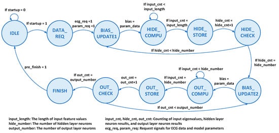 The feed-forward inference computation of ANN is completed by reusing the PU to serially process neurons, which is controlled by an FSM, as shown in Figure 10. When the transmission from the data handler to the input feature buffer is finished, the startup signal is set to high to activate the FSM. In the DATA_REQ state, the ecg_req and param_req signals are set to one to require input feature values and NN parameters. The computation of each neural network layer is divided into four steps. Taking the hidden layer as an example: (1) In the BIAS_UPDATE1 state, the bias register is updated to the corresponding bias value of the currently processed neuron; (2) The computing of input feature values and weights is completed in the HIDE_COMPU state. The input_cnt signal is responsible for counting the number of input values; when input_cnt is equal to the length of the input feature, indicating that all input values of one neuron have been calculated, then the state jumps to HIDE_STORE; (3) The ReLU operation is performed in the HIDE_STORE state, which is implemented by comparing the signed bit of the previous output values of the PU. If the sign bit is 1, which represents the negative value, 0 is stored as the result; otherwise, the input value will remain unchanged and will be stored directly, and an 8 × 16-bit register group is used to store the results of hidden layer neurons; (4) Finally, the processed neurons are counted in the HIDE_CHECK state. Once the hide_cnt is equal to the number of hidden layer neurons, the computation of the entire layer is completed. Otherwise, the next state will enter BIAS_UPDATE1 to start computing the next neuron. The operation of the output layer is similar to the above process, except that there is no ReLU operation in the OUT_STORE state, and the results are directly stored.