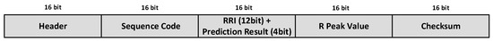 The data transmitter includes a data packaging module and a UART module. After an R-peak is detected and the classification of its previous heartbeat is completed, all results are collected and packaged into a data frame, which includes the RRI, prediction result, and R-peak value, as shown in Figure 11. To ensure correct transmission, each data frame also includes a header, sequence code, and checksum. The header is a fixed 16-bit width value. For each data frame sent, the sequence code is incremented by one. A simple addition verification method is adopted to generate the checksum. The data frame is transmitted by UART, which is used due to its low resource usage, and the communication rate fully meets the application requirements.